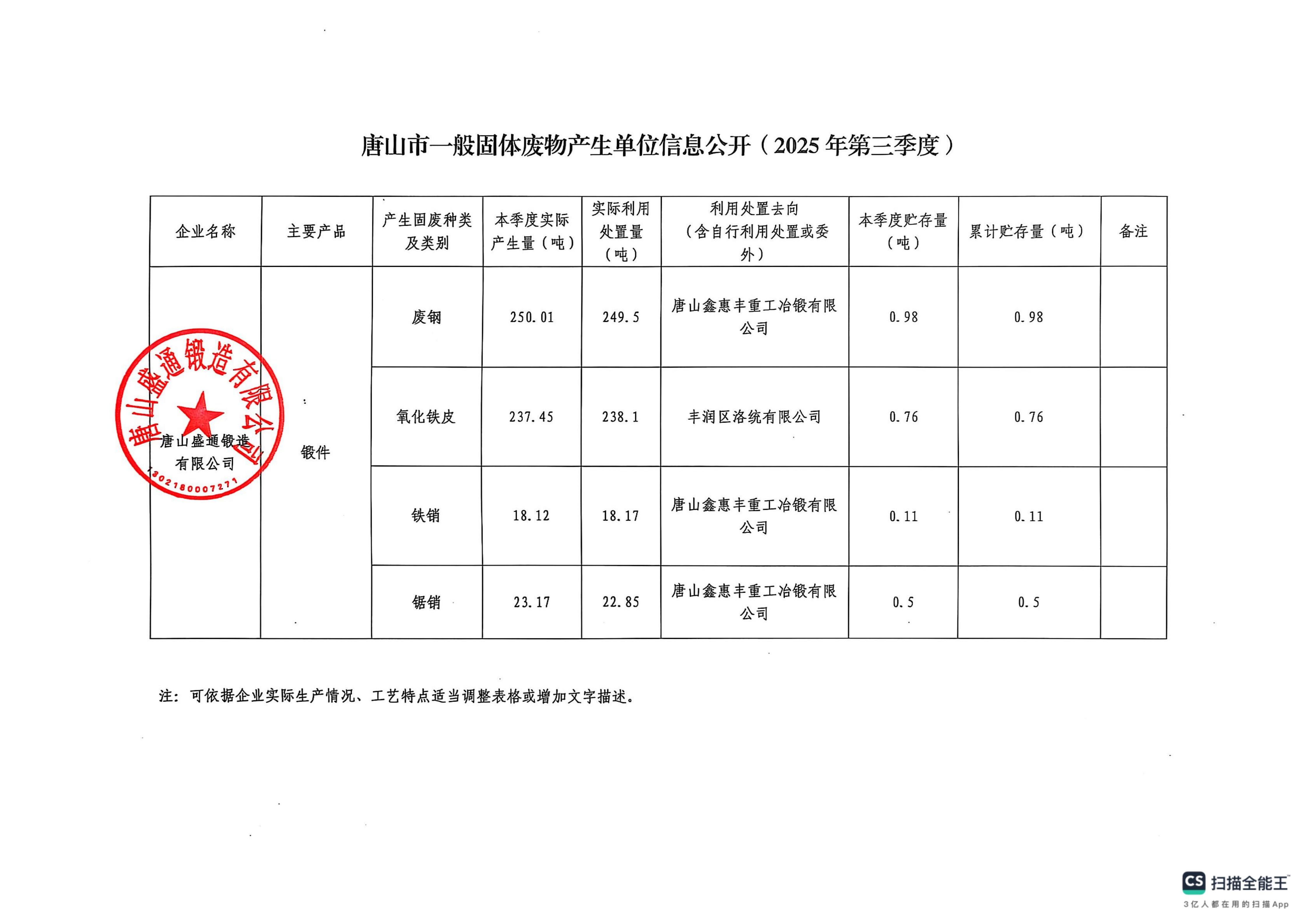 唐山市一般固体废物产生单位信息公开(2025年第三季度)